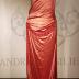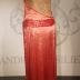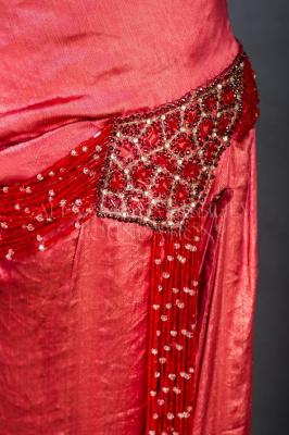 Asymmetrical evening gown in pink lamé embellish with pearl galloon and with a decorative belt made of tubular pearl fringe falling on each side.