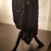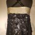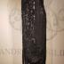 Evening gown in black tulle covered in an elaborate pattern of jet beads, black sequins, large faceted domes, triangles and bars, having narrow strap. Bodice banded at top in gold lame. Lower skirt of shaped pickets, side over-panels with rounded hem wrap across back, attached under-dress of silk, tulle and lace.