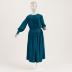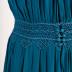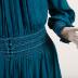 Emerald green silk dress with ethnic motifs, thin openwork stitching along the bodice, puffs and embroidery on the collar, cuffs and waistband.