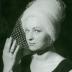 She is dressed in a black sleeveless t-shirt and she wears a turquoise tulle helmet with silver veil, designed by Gérard ALBOUY (autumn/winter collection).