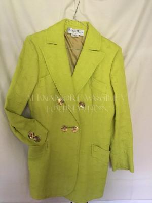 Yellow double-breasted long jacket from embossed with playing card pattern fabric. Peaked lapels, slash pockets with hacking flaps, gilded irregular shape buttons.
