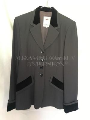 Grey single-breasted jacket with notch lapels, pocket flaps and roll-up cuffs decorated with black velvet.