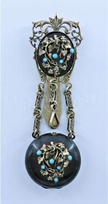 Chatelaine with an attached watch-case decorated with floral, grapes silver motifs and little turquoise stones. This chatelaine is in "Bois Durci", composed of blood mixed with sawdust. These small objects, called "articles of Paris" were really successful during the second half of the 19th century.