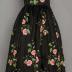 Black silk organdy embroidered with pink morning glories gown. Fitted sleeveless bodice, bow on each shoulder, gathered full skirt, black inner dress with separate zipper.