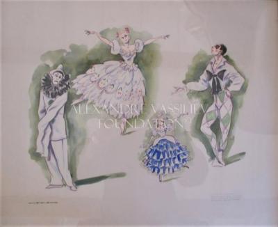 Watercolor "Carnaval" with four characters. All four of them are from the ballet Carnaval originally a piece for piano composed by Robert Schumann in 1834-35 and choregraphed by Michel Fokine first in 1910, in particular for the Serge de Diaghilev's company Ballets Russes. An inscription at the right bottom of the watercolour indicates four names of dancers who have interpreted these characters of Carnaval throughout the years: Paul Grinwiss, Olga Morosova, Nina Verchinina, Dokoudovsky.