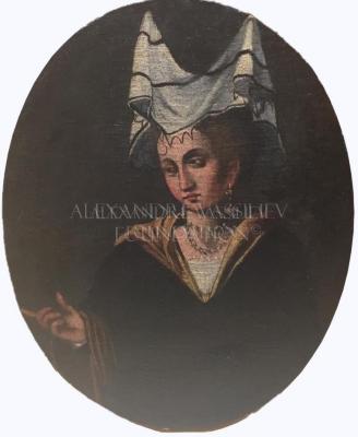 Oval portrait of a woman in a 15th century costume. She is wearing a butterfly hennin headdress and a long dark robe with yellow or golden lining.