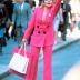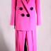 Pink wool pantsuit with black silk diagonal part on the back of the jacket. The suit consists of the trousers and the jacket with four large black buttons.