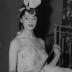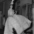 This photograph depicts the model Jill GREEN getting fitted by a dresser under her skirt, while holding a poodle named Tuppence. The vylon tulle strapless ball gown she is wearing is patterned with flowers and arabesques made out of shiny beads all over the bust and divided in stripes on the large skirt. The outfit is accessorized with a small white hat over which is perched a yellow rose and a high feather.