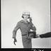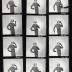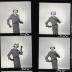 This photograph features several shots of the same model wearing a jacket and skirt suit closing with two large buttons and a ribbon tied in a knot. The outfit is accessorized with a clear-coloured striped hat, gloves and earrings.