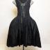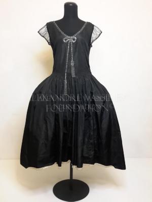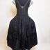 Black taffeta dress with rhinestone and seed-beaded trompe l'oeil bow to the bodice front, shirring to waist, tulle puff sleeves, the hem faced in ivory taffeta, with integral black taffeta hooped panniers.
