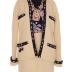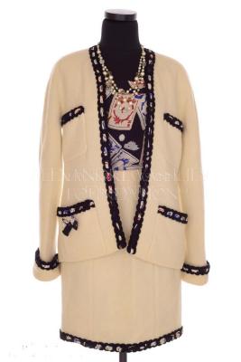 Three-piece suit, comprising cream boucle wool jacket lined in printed silk with playing card motif; wool skirt; matching printed silk sleeveless bodice.
