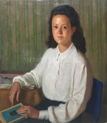 Painting portrait of a woman wearing a white long sleeved shirt, sitting on a blue chair holding a book.