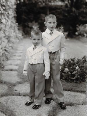 Portrait of Hubert and Philippe DESSAINT in page boy suits at the FOURNET wedding in Amiens, France in 1953.
