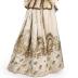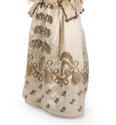 An embroidered ivory bustle silk skirt panel converted into a fancy dress outfit by the 'School of Needlework 58 New Bond St', the skirt worked in a gilt strip with fernlike fronds and strapwork.