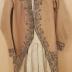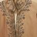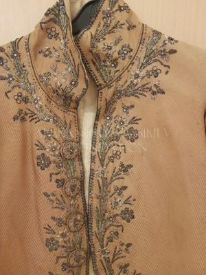 Tan color jeweled and metallic embroidered coat. Silk woven pinstripe, tall stand collar, cuff, scalloped pocket flaps, and back pleats, decorated with metallic embroidery, sequins, colored paillette and paste jewels, embroidered buttons throughout, silk ivory lining.