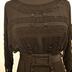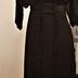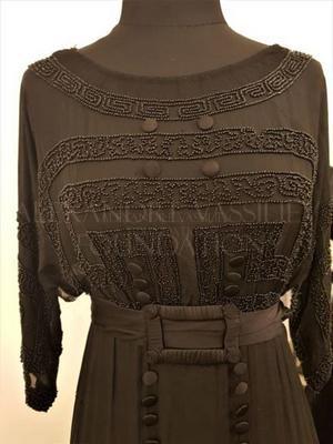 Black silk gown with directoire style buckle to the raised waistline, satin covered buttons and the hem with bugle beads.