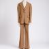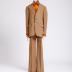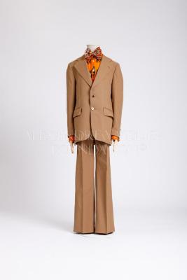 Two-piece camel colored polyester twill men's suit with fitted jacket and slightly flared trousers. A single-breasted jacket closed with 2 plastic buttons, has wide lapels, sleeve vents closed with 4 buttons, two patch pockets with rounded flaps and one single chest leaflet pocket, a deep vent at the back and 2 breast internal pockets. Trousers has two slanted pockets at front, one rear welt pocket with a hinging loop, and zip closure.