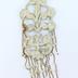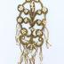 Openwork garment applique embroidered with golden metal beads, probably brass, and round pearlĀ beads forming stylized lily flower pattern with tassels on the bottom.