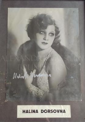 Press photography autographed by Halina DORSOWNA cabaret vedette at the Folies Bergeres in 1927-1928 in "La Grande Folie". The autograph was given to his friend Alexandre VASSILIEV in the 1980s. Mr. VASSILIEV then had framed the photograph with the artist name label of the dressing room. (It is interesting to note that the spelling of DORSOWNA here is written in two different ways, Since the 1920s, the letter V and W has always alternated in the name of the artist as can be seen on the large poster in the VASSILIEV collection or the articles published in the 1920s.)