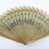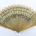 Small fan for young lady or a little girl, entirely made of horn with openwork design, adorned with hand painted pink roses, red and yellow flowers and blue forget-me-nots, a flower of purety usually attributed to young, not married women. On the top beige colour silk ribbon holds 21 sticks together.