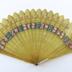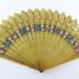 Small fan for young lady or a little girl, entirely made of horn with openwork design, adorned with hand painted pink roses and blue forget-me-nots, a flower of purety usually attributed to young, not married women. On the top beige colour silk ribbon holds 22 sticks together.