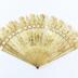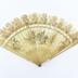 Small fan for young lady, entirely made of horn with embossed design of golden flowers in the center, adorned on the top with stylized floral and vegetal motifs. On the bottom and on the first and last sticks, the fan is embellished with round steel nail inserts. On the top beige colour silk ribbon holds 23 sticks together.