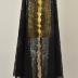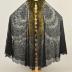 Large black rotunda of dotted net with floral clusters within large teardrop-shaped swags above a large-scale floral border and scalloped at the hem. Machine imitation of Chantilly. There is no such trick in manual technology filling a dense pattern.