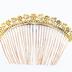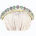 Women's diadem tiara comb, with upper part richly decorated with stylized violets of purple rhinestones, with green leaves and yellow centers. Under the floral ornamentation, an embossed pinchbeck stripe with floral and vegetal motifs, surmounted with a line of diamond imitating rhinestones.