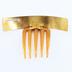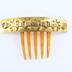 Tiara style comb in blond tortoiseshell imitating celluloid, with diadem part in brass with embossed decoration of three horseshoes. Horseshoes have long been considered lucky. They were originally made of iron, a material that was believed to ward off evil spirits, and traditionally were held in place with seven nails, seven being the luckiest number.