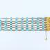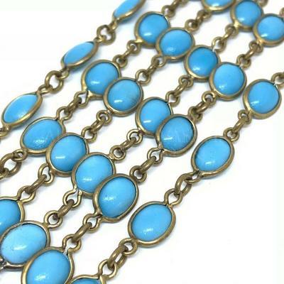 Women's bracelet consisting of a pinchbeck buckle with push in clasp, decorated with embossed floral motifs. The bracelet has six brass chains with oval turquoise glass stones. Thin security chain is attached to the buckle and the clasp.