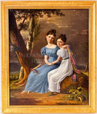 Full length painting portrait of two sisters represented on a romantic movement landscape. The elder one, Aimée VIEILLOT (1816 - after 1865), is wearing a blue colour dress with short balloon sleeves and a bow hairstyle. The younger lady, Louise VIEILLOT (1818 - ?), is wearing a same style dress of light white colour and similar hairstyle. Two women are cuddling each other and linked with a multicolour shawl. The portrait of two sisters comes from the family collection of Paul POIRET.