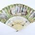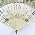Painted leaf fan with 20 ivory sticks, openwork, carved and handpainted with flowers and small dressed up caracters. The main side is in paper with handpainted pastoral center scene, representing two women and two men in front of a country house. On the right and the left of the main scene, there are smaller images. All on a green background with multicolour flowers and golden stripes.