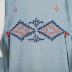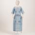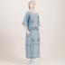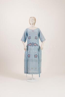 Powder blue lightweight wool crepe day dress with navy blue, orange and white beads embroidery.