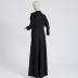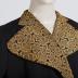 Black woolen cloth coat to the floor, double-breasted, with four black plastic reliefed buttons fastening, princess seams, set-in sleeves with raised caps on shoulder pads, and a collar with wide beveled lapels, which are covered with black and gold floral patterned brocade.