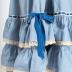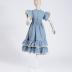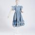 A light blue cotton summer dress for a girl, with a short V-neck, flutter sleeves, gathered along the armhole and edged with thin white lace, rear button fastening to the waist and gathered skirt. The midi skirt has two gathered frills at the bottom, edged with thin lace, and a lace border at the top of the upper frill with a blue silk ribbon threaded through it and tied into a bow on the right side.