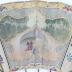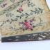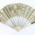 Painted leaf fan with 15 ivory sticks, engraved with vertical silver inserts with openwork detailing on the first and last sticks. Decorated on the handle with two rhinestones from both sides. The main side is in silk with handpainted gold framing of floral and vegetal ornaments, handpainted garlands of pink roses with leaves, blue bell flowers and branches of purple flowers, embroidered with silver sequins, and decorated with a center scene representing a park landscape (certainly a grove of the Versailles Palace garden) with a walking couple: woman in pink gown and a noble man.
