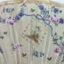 Painted leaf fan with 16 ivory sticks, openwork and inlaid with silver inserts forming stylized floral ornaments, and openwork motif on the first and last sticks. The main side is in silk with handpainted in gold vegetal ornaments with blue and pink floral garlands, embroidered with metal sequins, and decorated with a center scene representing a noble woman in pink gown sitting with a turned back to a man standing near a well.