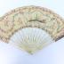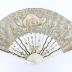 Painted leaf fan with 18 ivory sticks, engraved and handpainted with roses and leaves, and circular silver inserts. Decorated on the handle with two rhinestones from both sides. The main side is in thin cotton on paper base richily adorned with striped pattern embellished with floral and vegetal ornaments of silver thread embroidery with metal sequins forming floral garlands, and decorated with the center scene representing a mythological inspired scene with a well dressed woman in a blue and pink gown holding flower wreaths in front of a pedestal with a floating in the air angle holding a torch.