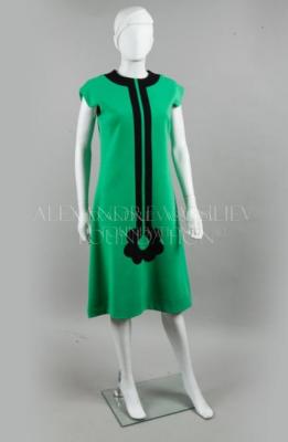 Sleeveless midi dress in meadow green wool, with black floral pattern on the front and round neckline. Fall / winter collection 1971-1972.