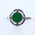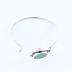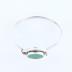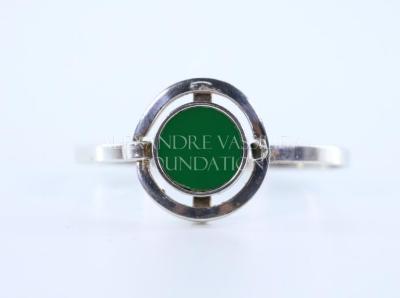 Modernist style woman's cuff bracelet, consisting of a thin main body connected to the front metal circle containing another round circle with flat green plastic glass cabochon.