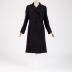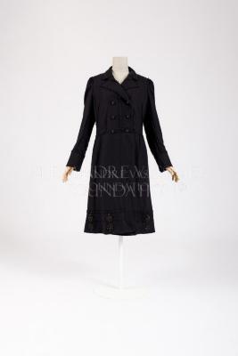 Black wool cloth ensemble – double-breasted with beads embroidery on the bottom coat and cocktail dress with straps with beads embroidery on the bottom. From House of Dior prêt-à-porter collection.