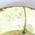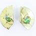 New Wave style artistic pair of ear clips handmade of gold painted bent metal sheet with large green glass stones attached by a metal wire.