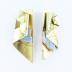 New Wave style artistic pair of ear clips handmade of gold painted bent metal sheet with a piece of blue ceramic tile attached by a metal wire.