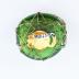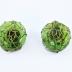 New Wave style artistic pair of ear clips, each handmade of a large round green glass stone covered by a metal wire web.