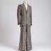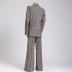 Grey wool in red, black and pink Prince of Wales check summer men's suit consists of single-breasted jacket with wide peaked lapels and wide trousers. House of Ted Lapidus numbered "027213". The jacket closed with two buttons and has three more on each sleeve, deep patch rounded pockets with pointed flaps and doesn't have chest pocket; lined with branded monogrammed viscose silk, on the left forepart has a white metal medal with brand's name engraving.