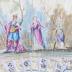 Painted leaf fan with 19 ivory sticks, carved and engraved with handpainted scrolled floral and vegetal motifs, with openwork detailing on the first and last sticks. Decorated on the handle with two mother of pearl circles from both sides. The main side is in paper with handpainted blue framing of red and yellow floral and vegetal ornaments, and decorated with a center scene representing a mythological allegory scene of two women standing with a Roman soldier dressed caracter. Another soldier is laying down on the left, and three heads wearing helmets are visible on the left background