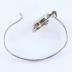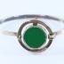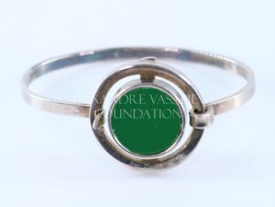 Modernist style woman's cuff bracelet, consisting of a thin main body connected to the front metal circle containing another round circle with flat green plastic glass cabochon.
