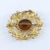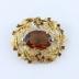Large brooch, consisting of an oval topaz glass gemstone mounted on an openwork golden metal frame with vegetal ornaments of vine leaves embellished with small amber rhinestones. The brooch is a part of "Heritage" collection.