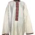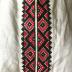 White linen Ukrainian folk shirt, with traditional geometric cross embroidery on the neckline and cuffs in black and red tones.