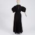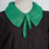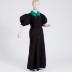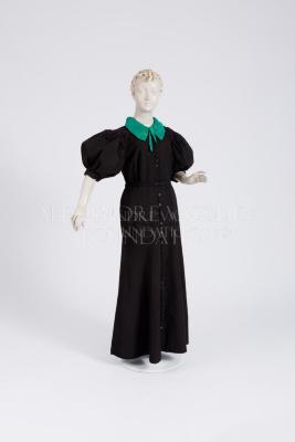 Black silk moire evening dress to the floor, waist cut-off, with a slightly flared skirt, grandiose lantern sleeves, which are tapered to the cuffs with darts, and with double turn-down collar - the lower layer is made of quilted moire, the upper layer and the bow at the neck are made of emerald green lamé with a metallic sheen, has a false center front closure with covered buttons along the entire length (8 buttons on the bodice, 30 on the skirt), a real snap fastening is in the left seam. Has a separate narrow belt with a round moire covered buckle.
